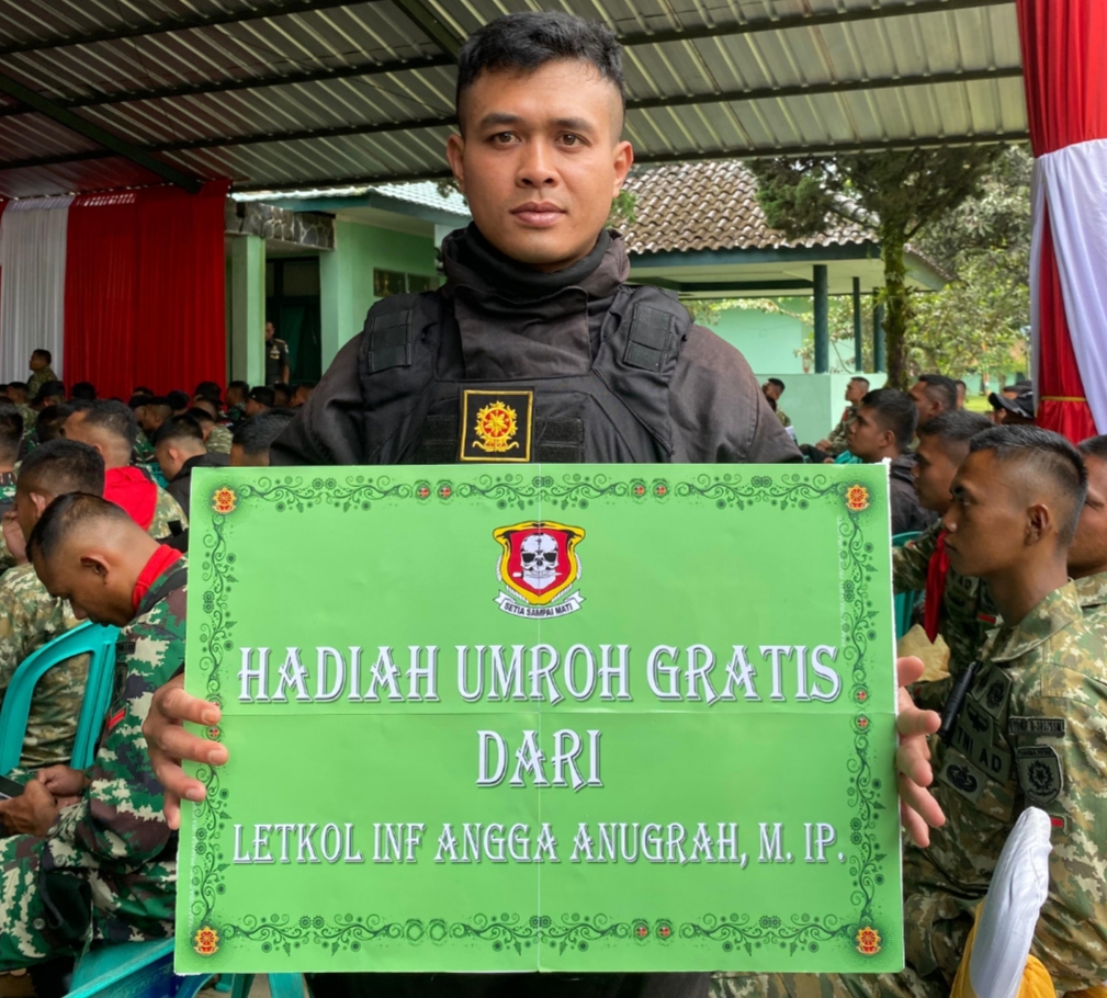 “Saya berpesan siapapun Danyonnya tetap dukung dengan loyalitas dan dedikasi yang tinggi serta meyakini bahwa batalyon ini bisa memiliki kemampuan lebih. Setiap manusia ada kelebihan dan ada kekurangan, untuk itu saya mohon maaf bila selama saya memimpin ada kekurangan dan kesalahan. Saat ini juga saya akan menyerahkan paket umroh kepada prajurit terbaik yakni Praka Imam Sudrajad, semoga berkah,” tutup Letkol. Inf Angga.