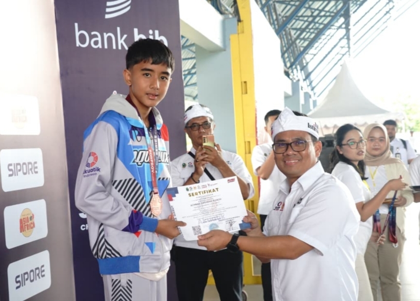 Ketua Ketua Umum Akuatik Indonesia Garut, Agus Ismail, serahkan piagam kepada atlet renang.