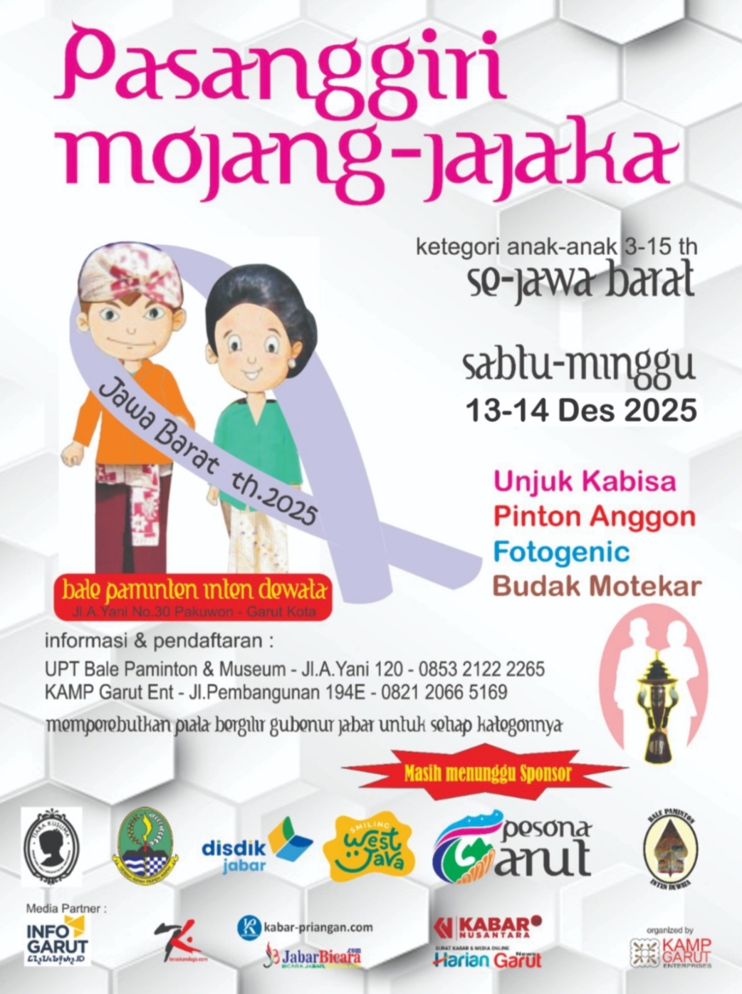 yang akan dilenggarakan pada Sabtu – Minggu, 13-14 Desember 2025 mulai pk.09.00 sampai dengan selesai di Bale Paminton “Inten Dewata” Jl.A.Yani – Garut. Bagi orang tua dan guru yang ingin mendorong anak-didiknya mengenali warisan budaya leluhur ini, masih bisa mendaftarkan anak-anak maupun peserta didiknya hingga hari Kamis, 4 Desember 2025 berbarengan dengan kegiatan Pengundian Nomor Peserta.